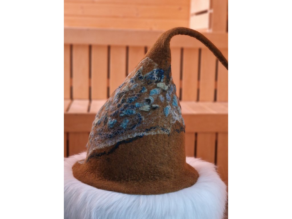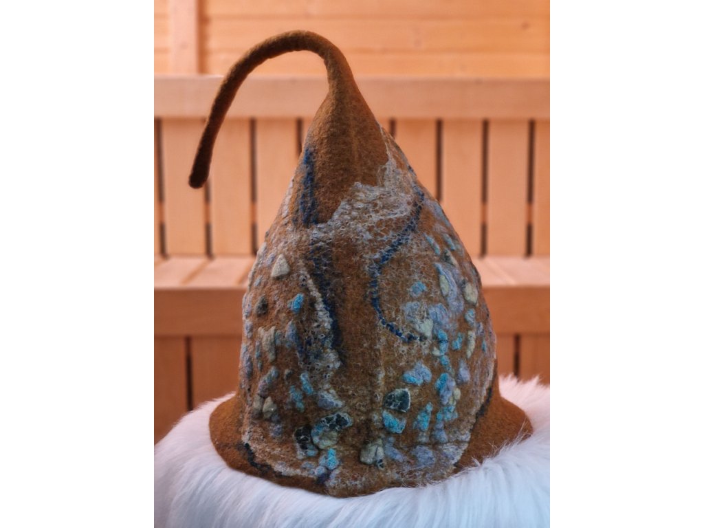 Klobouk do sauny (saunová čepice) v originálním provedení. Tradiční, ruční výroba ze 100% přírodní ovčí vlny. Perfektní ochrana vaší hlavy při saunování.