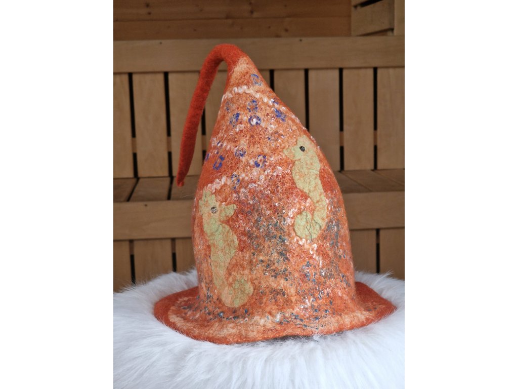 Klobouk do sauny (saunová čepice) v originálním provedení. Tradiční, ruční výroba ze 100% přírodní ovčí vlny. Perfektní ochrana vaší hlavy při saunování.