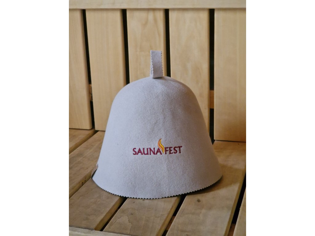 Nápaditý klobouk do sauny (saunová čepice), vyrobený ze 100% přírodní ovčí vlny. Obsahuje originální logo Saunafest / Herbal cup.