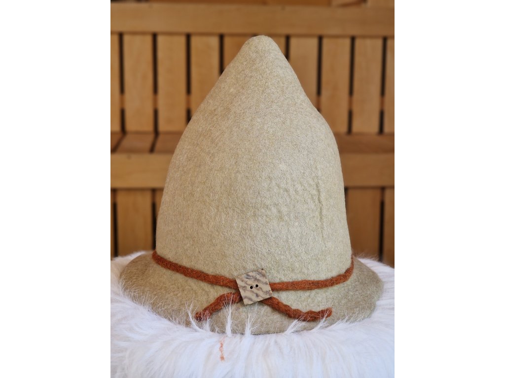 Klobouk do sauny (saunová čepice) v originálním provedení. Tradiční, ruční výroba ze 100% přírodní ovčí vlny. Perfektní ochrana vaší hlavy při saunování.