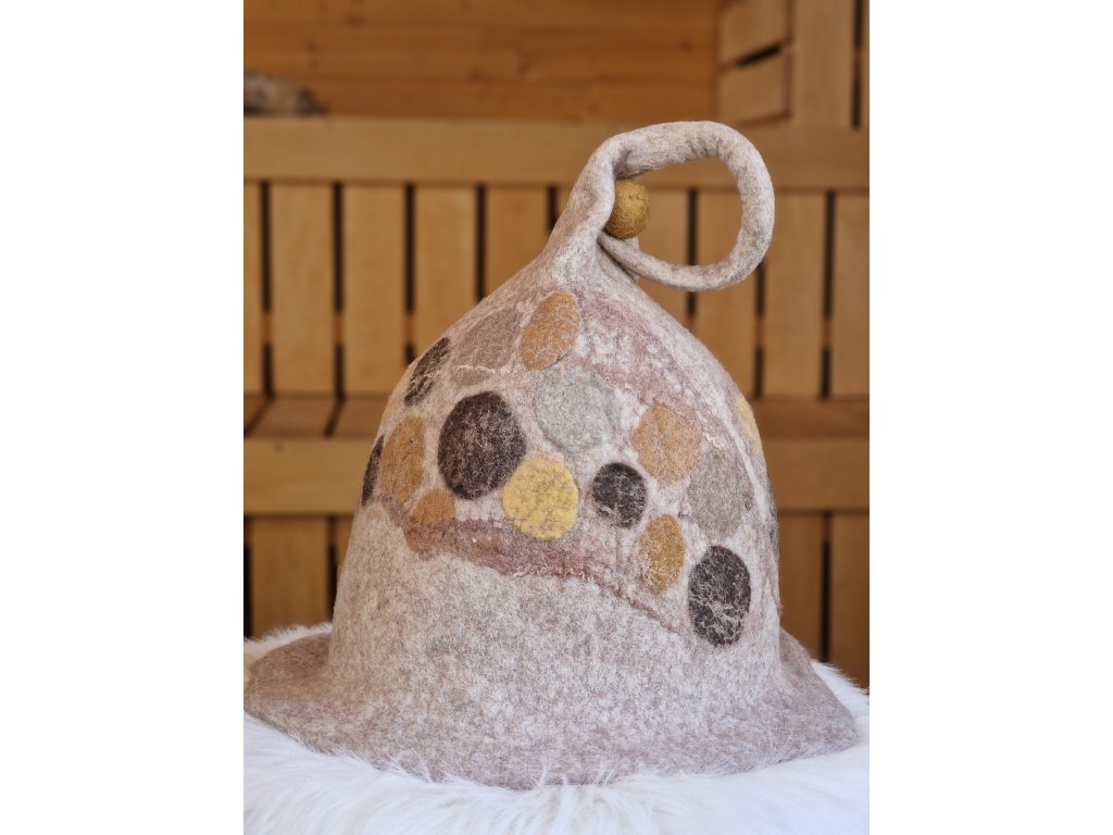 Klobouk do sauny (saunová čepice) v originálním provedení. Tradiční, ruční výroba ze 100% přírodní ovčí vlny. Perfektní ochrana vaší hlavy při saunování.