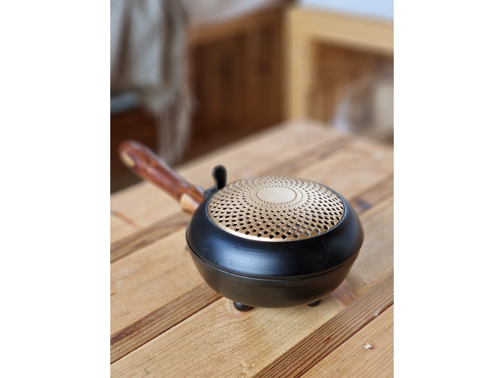 Set kvalitní kovové kadidelnice připravený na použití. Dřevěná rukojeť zajišťuje velmi bezpečné používání, ideální pro saunéry, použití ve wellness & SPA.