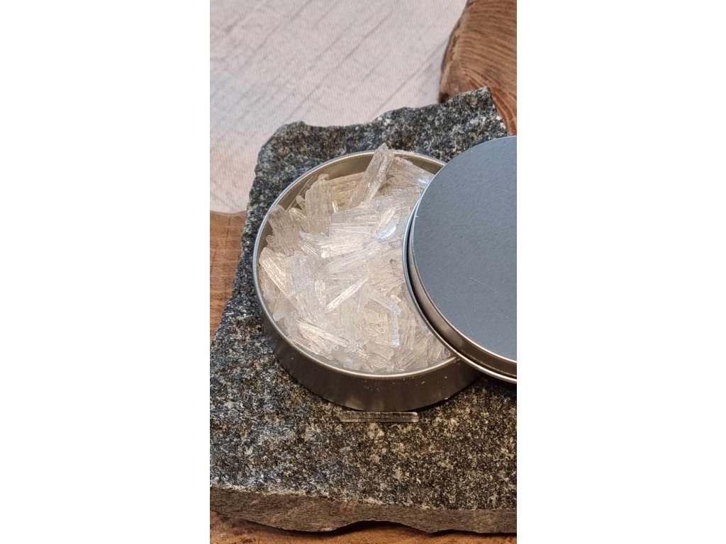Menthol je chladivá, krystalická látka, která se přirozeně nachází v mátě peprné. Krystalky se vyrábí extrakcí a krystalizací při ochlazení éterického oleje z máty peprné (Mentha arvensis), jedná se tedy o přírodní produkt. Naše krystalky jsou velmi intenzivní a proto stačí použít jen 1-2 ks jednotlivých malých krystalků na jedno saunování. Krystalky se ze lžičky položí na rozpálený kámen v sauně (sami zkapalní a velmi rychle přichází mentolová vůně - nepolévají se). Mohou se rozpustit i v teplé vodě a polévat saunové kameny. Mentolová vůně naplní saunu.