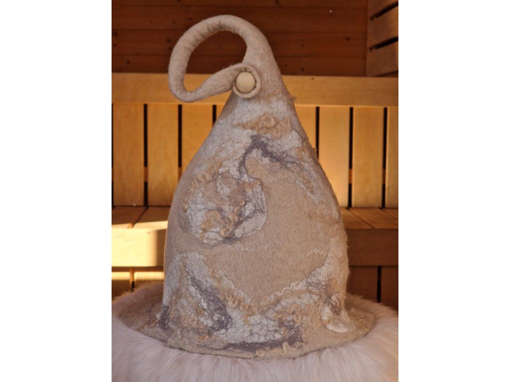 Originální saunový klobouk z 100% přírodní ovčí vlny, vytvořený tradiční ruční technikou. Poskytuje vynikající ochranu hlavy při saunování a zároveň si udržuje svůj tvar díky pevnějšímu, kvalitně zpracovanému materiálu.