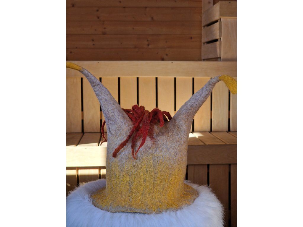 Originální saunový klobouk z 100% přírodní ovčí vlny, vytvořený tradiční ruční technikou. Poskytuje vynikající ochranu hlavy při saunování a zároveň si udržuje svůj tvar díky pevnějšímu, kvalitně zpracovanému materiálu.