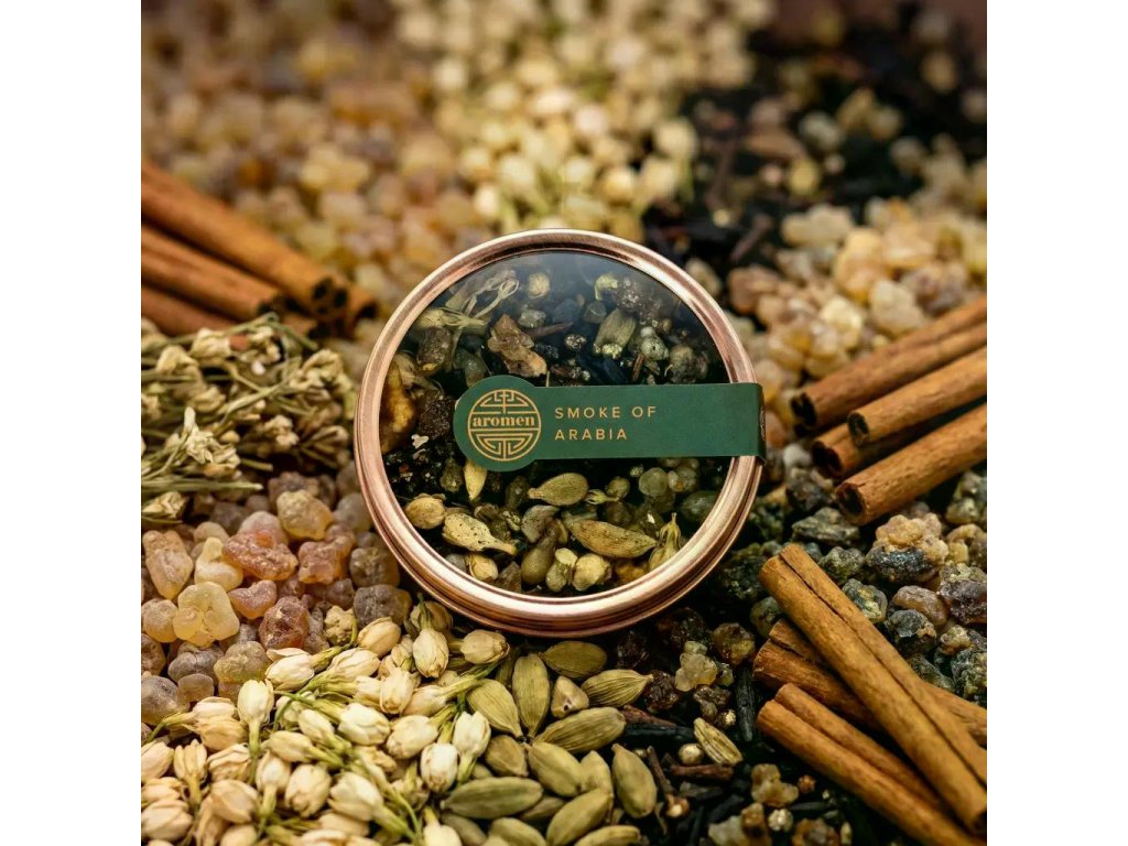 Vykuřovací směs Smoke of Arabia od AROMEN propojuje vzácná kadidla s jemným květinovým a hřejivě kořeněným akcentem. Bohatá vůně podporuje soustředění, vědomý rituál a hlubší propojení s přítomným okamžikem.